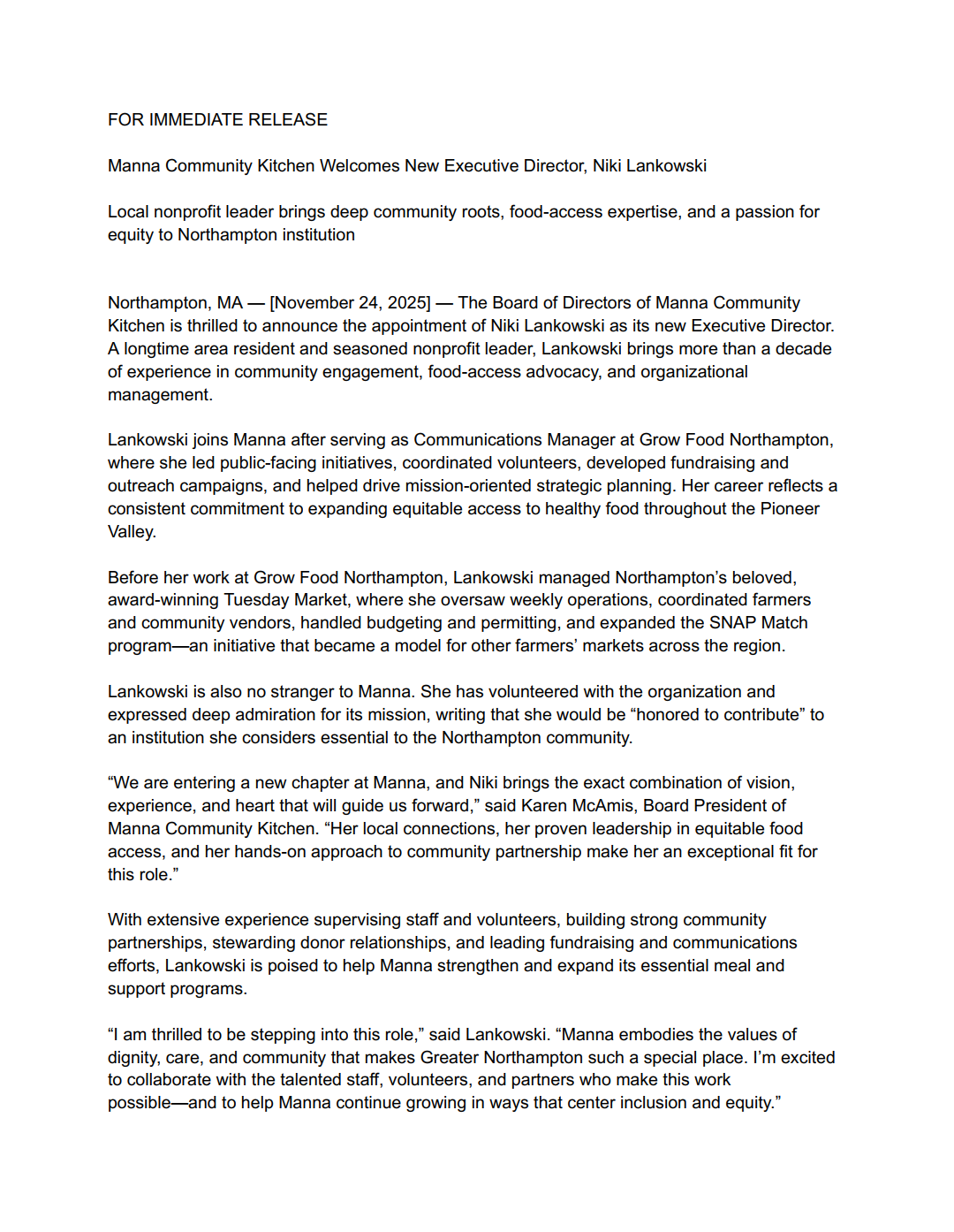 I look forward to meeting you soon. I’ll be popping in to help with the Thanksgiving meal this week and officially starting on December 3. Please feel free to reach out- niki@mannanorthampton.org See you soon!